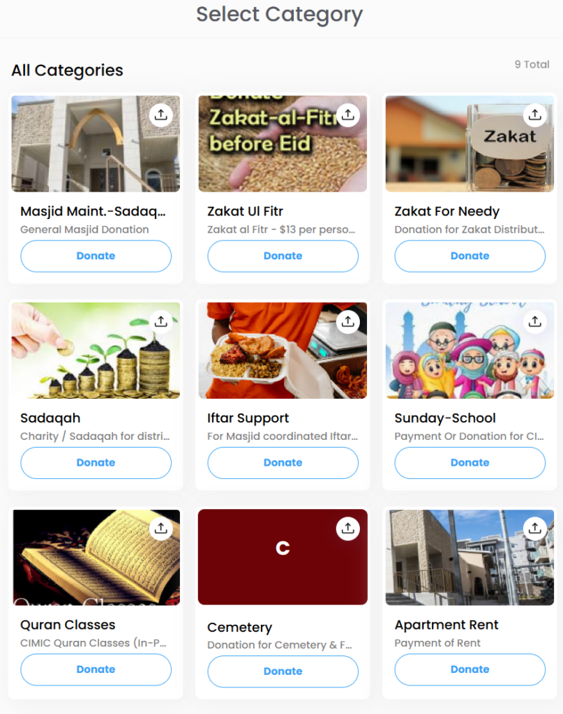Scroll down to make donations to other categories like Sadqah, Zakat, School, Cemetery etc.